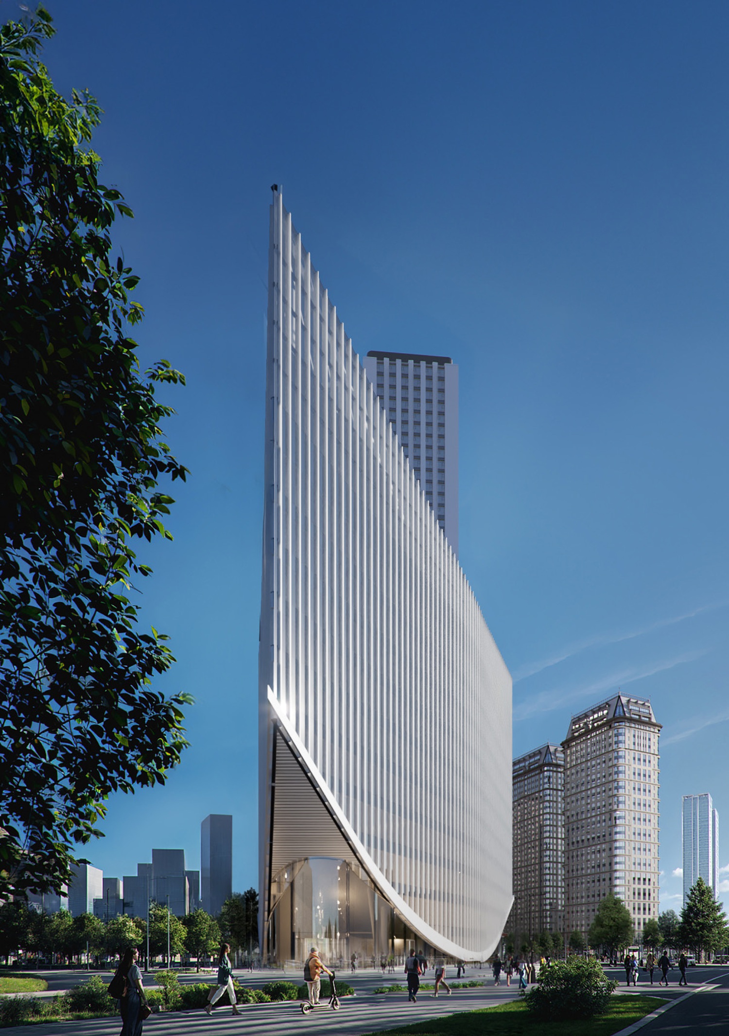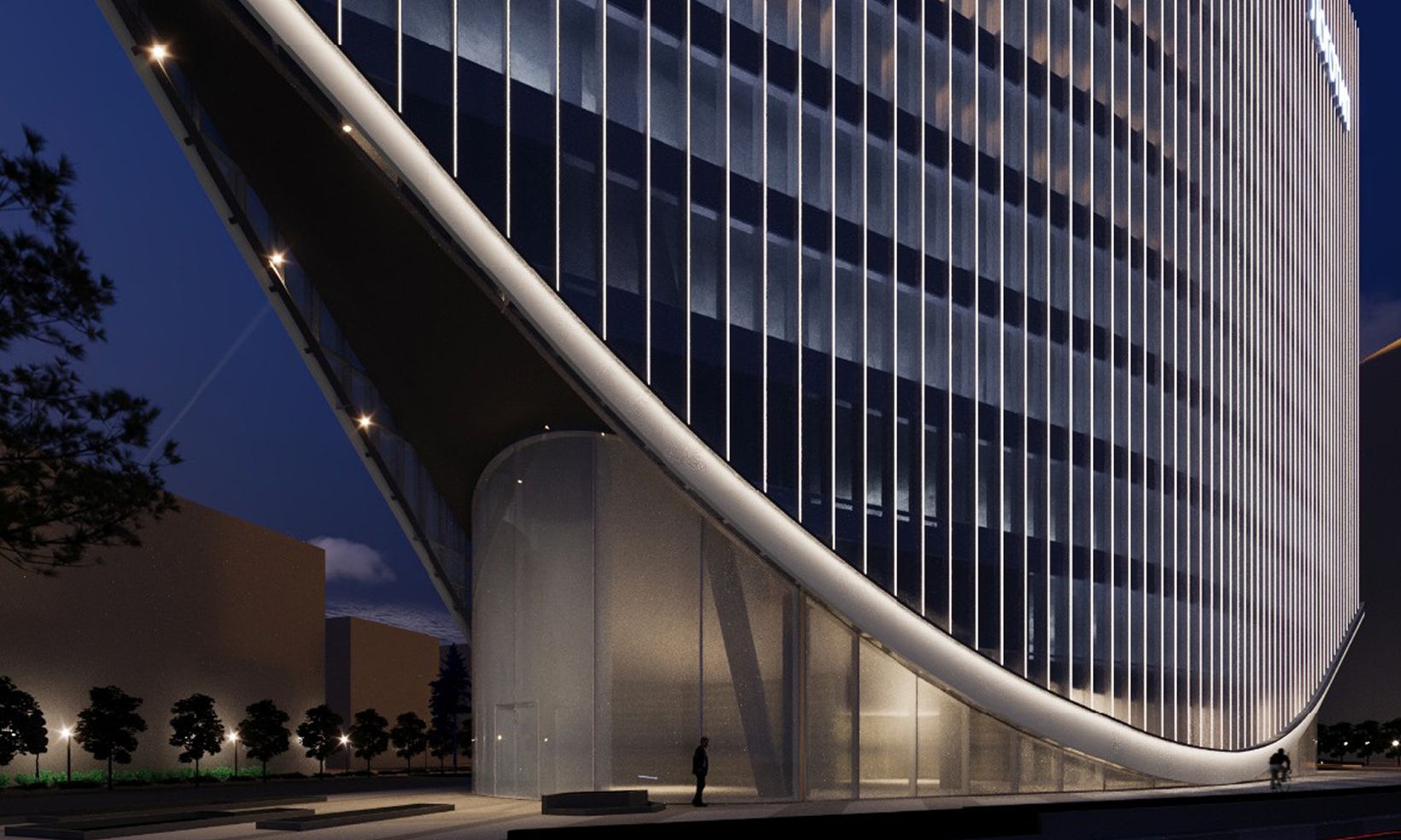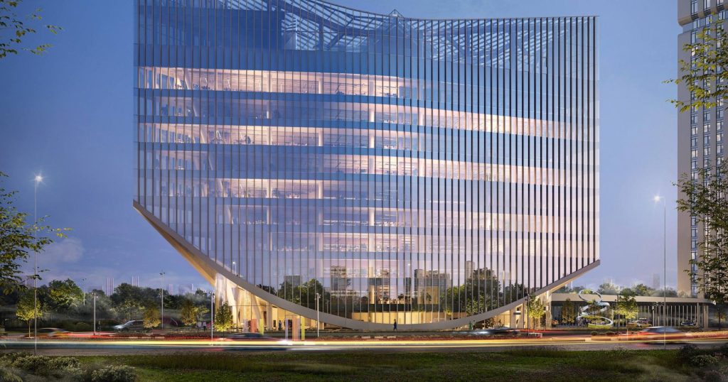 Проект разработан известным архитектурным бюро UNK Architects, которое вдохновилось образами современной яхты. Фасад здания представляет собой сочетание вертикальных ламелей, прозрачных стеклянных поверхностей и эффектной ночной подсветки. Концепция подчеркивает стабильность и успешность собственника офиса.
